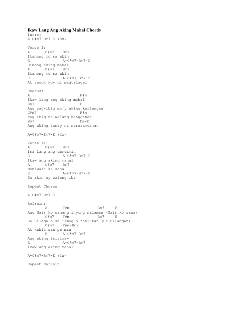 Create and get 5 IQ. Ang nais ko sanay inyong malaman. Kung sinong ang aking mahal ahh hah-- A Cm7 Bm7 Itanong mo sa akin E A Cm7 Bm7-E-Sagot koy di magtatagal ahh hah-- Chorus A Fm Ikaw lang ang aking mahal Bm7 E7 Ang pag-ibig moy aking kailangan Cm7 Fm7 Pag-ibig na walang hangganan Bm7 Dm-E-Ang aking tunay na nararamdaman A Cm7 Bm7-E-Ah hah hah-- A Cm7 Bm7 Isa lang ang.