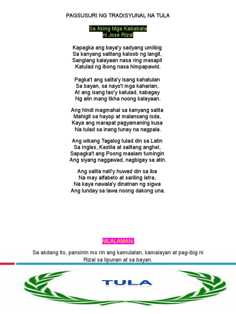 Itoy matatagpuan sa kanyang tulang Bayani na kinatha noong Mayo 1 1928 at ang Isang Tula sa manggagawa na nalathala sa pahayagang Pawis noong Hunyo 5 1946. TULA Sa artikulong ito tatalakayin natin ang ibat ibang halimbawa ng mga tulang Pilipino. Ang rosas nga ay may tinik Handa akong dito kumapit.
